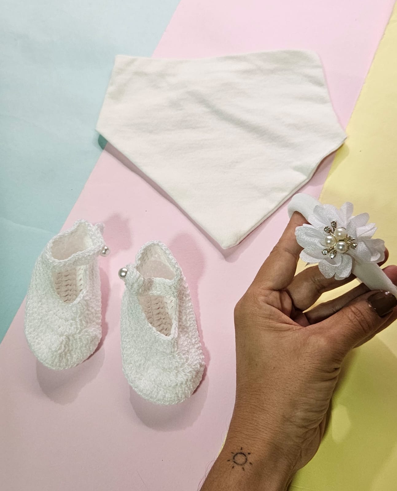 Kit Bebê com Laço na faixa, Sapato de Crochê e Babador quantidade